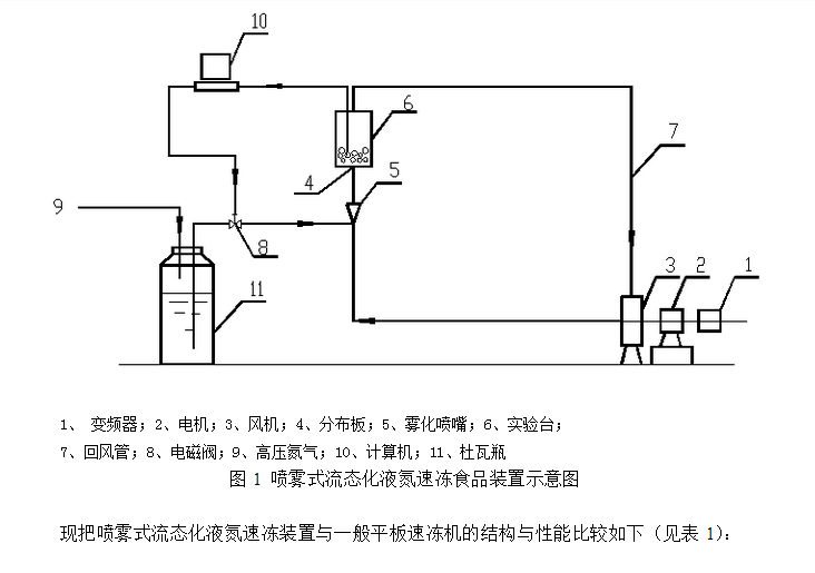噴霧式流態(tài)化液氮速凍裝置就簡(jiǎn)單得多(圖1),不需要壓縮機(jī)及蒸發(fā)器,冷凍裝置的致冷劑采用液氮噴淋汽化后提供,汽化氮?dú)庠陲L(fēng)管內(nèi)循環(huán)使用以提高冷量的利用率,它主要由離心式風(fēng)機(jī)、風(fēng)管、布風(fēng)板、變頻器、噴嘴、杜瓦瓶、高壓氮?dú)馄恳约坝?jì)算機(jī)數(shù)據(jù)采集系統(tǒng)和處理系統(tǒng)組成。風(fēng)機(jī)的轉(zhuǎn)速由變頻器輸出不同頻率的電流來(lái)實(shí)現(xiàn)對(duì)風(fēng)機(jī)的無(wú)級(jí)調(diào)速。風(fēng)機(jī)吹出的氮?dú)饨?jīng)導(dǎo)流后進(jìn)入到布風(fēng)板的下方,與從杜瓦瓶壓出經(jīng)噴嘴霧化的霧狀液氮混合后,再通過(guò)布風(fēng)板,把放在布風(fēng)板上的食品吹起。低溫混合氣體與食品充分熱交換后溫度升高,**后經(jīng)管道返回風(fēng)機(jī),完成一次循環(huán)。冷凍食品的冷量由液氮來(lái)提供,通過(guò)調(diào)節(jié)液氮的噴量來(lái)調(diào)節(jié)冷風(fēng)的溫度,能滿足不同介質(zhì)溫度的要求。計(jì)算機(jī)數(shù)據(jù)采集系統(tǒng)主要由溫度傳感元件(銅-康銅熱電偶)、A/D模數(shù)轉(zhuǎn)換器、信號(hào)放大器、壓力傳感器、風(fēng)速儀以及高性能計(jì)算機(jī)等組成。溫度由熱電偶傳送到信號(hào)放大器,放大后的電信號(hào)進(jìn)入A/D模數(shù)轉(zhuǎn)換器轉(zhuǎn)換成數(shù)碼信號(hào)后進(jìn)入到計(jì)算機(jī)并口錄入溫度值。同樣裝置的壓力由壓力傳感器變?yōu)殡娦盘?hào)經(jīng)放大器、A/D模數(shù)轉(zhuǎn)換器后進(jìn)入計(jì)算機(jī)錄入壓力值。熱風(fēng)速儀采集風(fēng)速后經(jīng)輸出口輸出到計(jì)算機(jī)。